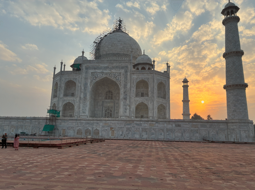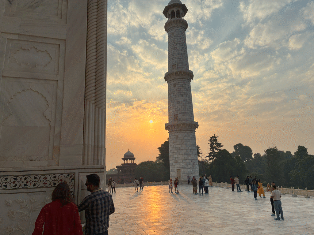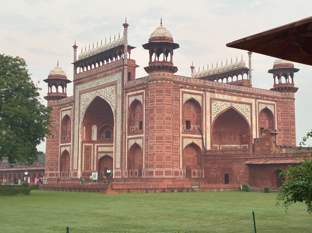 中央には、ムガル帝国の皇帝シャー・ジャハーンと、彼が深く愛した妻ムムターズ・マハルの記念墓(セノタフ)。静かに祈る人の姿も多く、空気は厳かな雰囲気に満ちています。