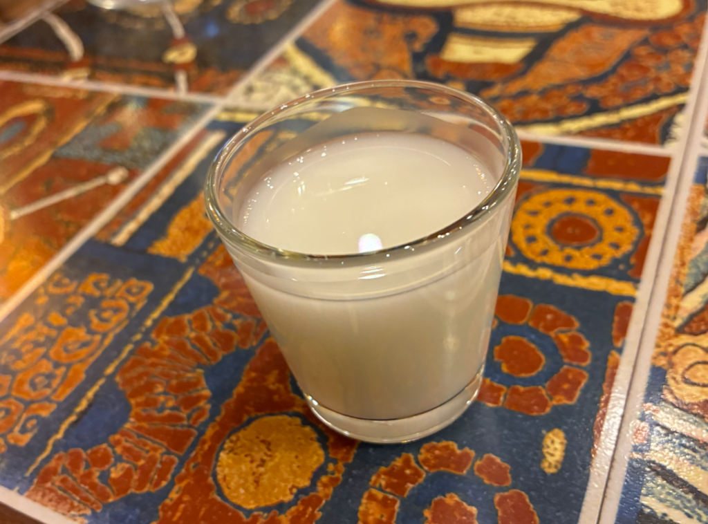 初手からぽい飲み物が提供されますシャラプ(Shalap)。発酵乳ベースの飲み物。私は苦手かも。馬乳酒(クミス / Kumys)のチャレンジ考えてましたがキツいかも。
