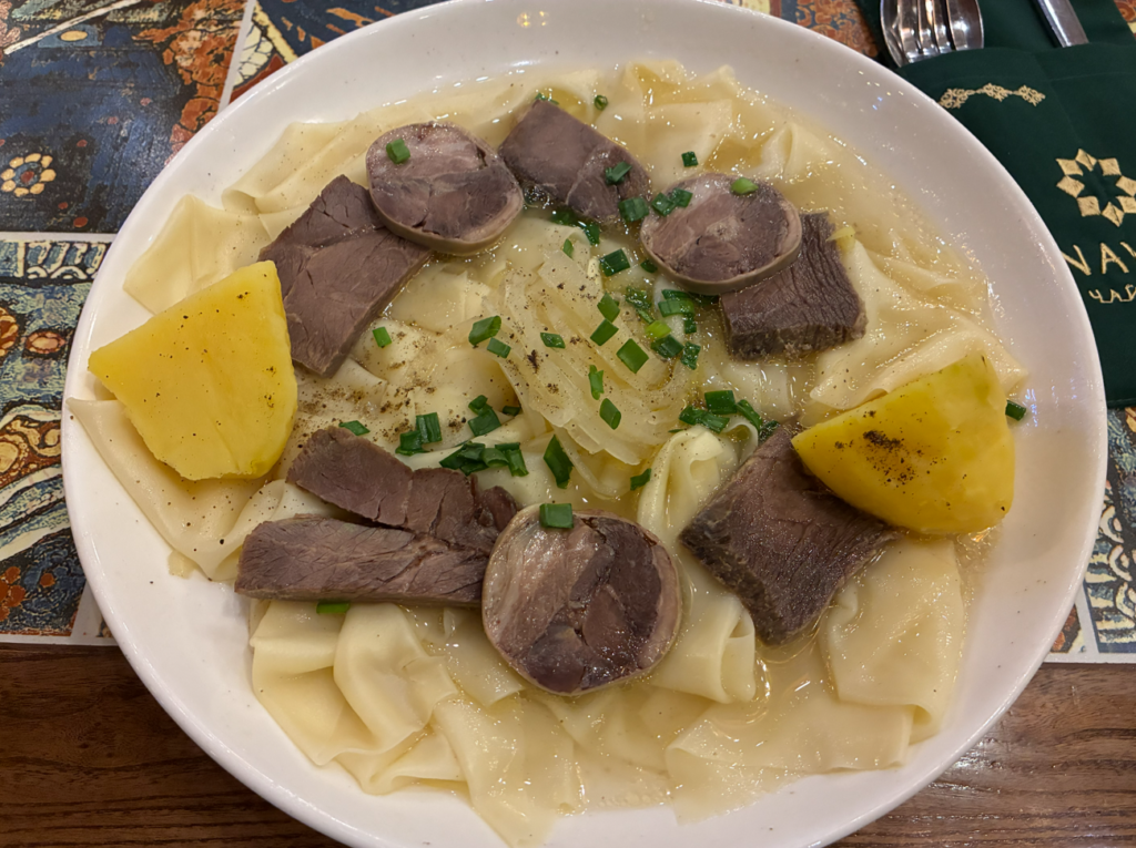 そしてカザフスタンの代表料理ベシュバルマク(Beshbarmak)。これを食べに来ました。茹で肉(牛 or 羊)+平たい麺+スープ。雰囲気は”きしめん”に近い薄味の料理。薄味なのに体がポカポカ温まります。きしめんより面がデカいので、食べるのは少し苦労しましたが、美味い。