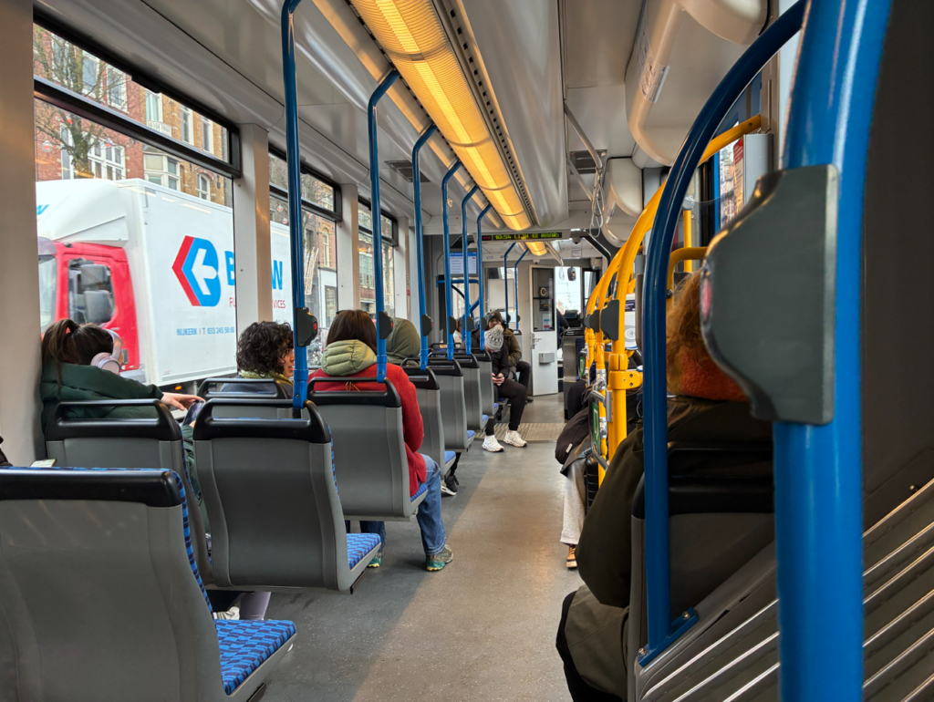 今日はバス、トラム(路上電車)、メトロ(地下鉄)、電車と様々な乗り物を使って移動していきますが、アムステルダムの乗り物はどれもクレジットカードを乗車時下車時にタッチする方式。これは、非常に便利。切符を買う必要も無ければ、支払い方法が統一されているので、悩まない。SuicaとかICOCAとか意味不明の独自カードとか全部廃止して全部この方式にして欲しいわ(笑)。上の写真はバスの内部、下はトラム。