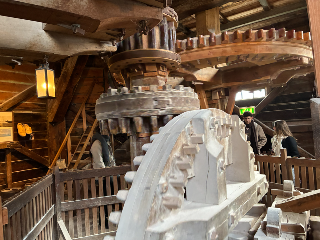 なんと風車の内部見学も出来ます。複数の歯車が回転し合い、風車を回転させているリアルを目に見ることが可能。木製の歯車が軋む音も大きく、大迫力。