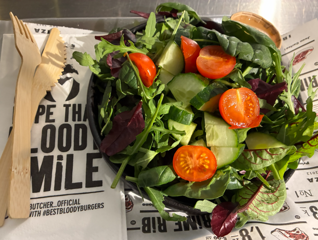 急にハンバーガーが食べたくなりThe Butcher。Googleマップ☆4.2。最近、野菜不足なのでサラダとオリジナルバーガー。美味い!が、高いので価格相応としよう。