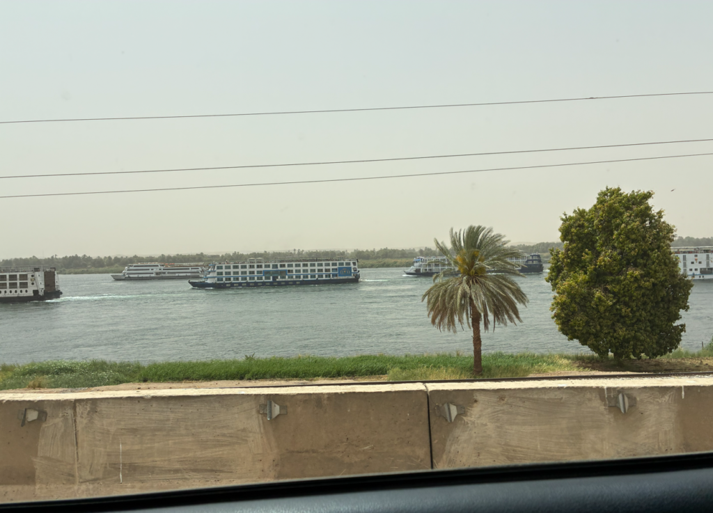 お次はホルス神殿から車で1時間ほど走り、コム・オンボ神殿(Kom Ombo Temple)へ。道中巨大なアスワンフェリーをナイル川で発見。パッと見ただけで6隻も。これがアスワン⇔ルクソールを巡行してるそうです。豪華なフェリー。