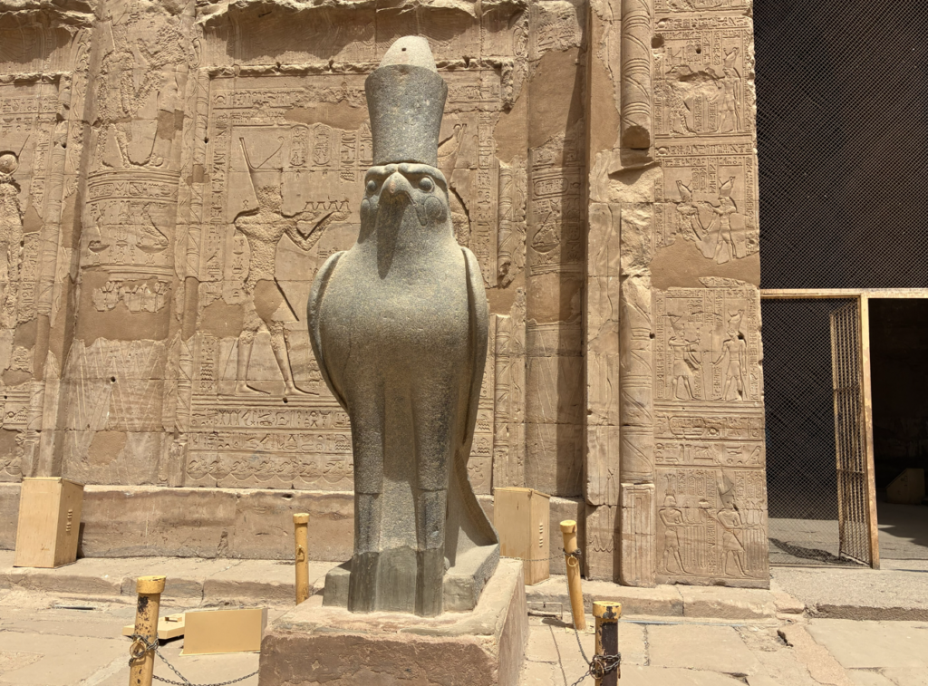 人気写真スポットのホルス神(Horus)。人体じゃなくて完全に鳥型の表現も普通にあるんだそうです。ちなみに、頭の上に乗ってるのは王冠。