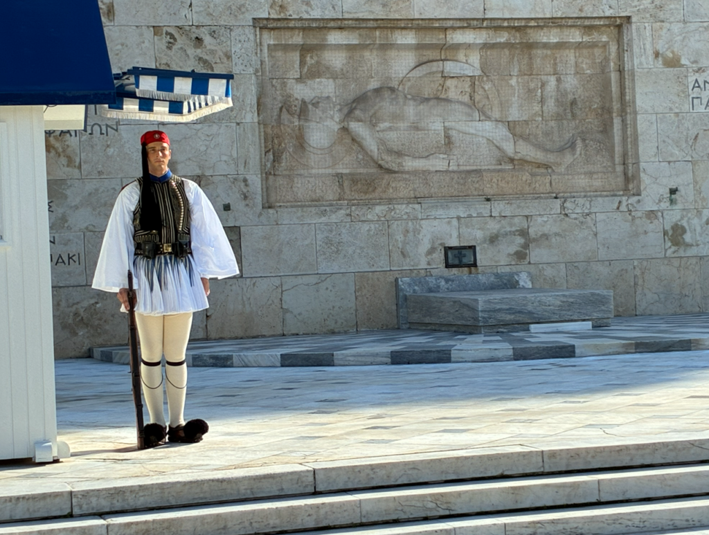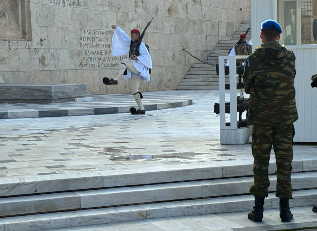 毎正時(1時間ごと)に実施されるエヴゾネス(Evzones)の衛兵交代式を見学。エヴゾネスと呼ばれる、ギリシャ陸軍の儀仗兵による公式セレモニーで、多くの人が見学に訪れています。