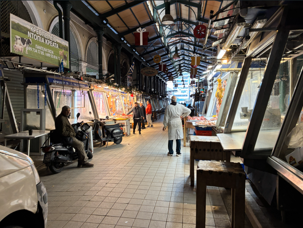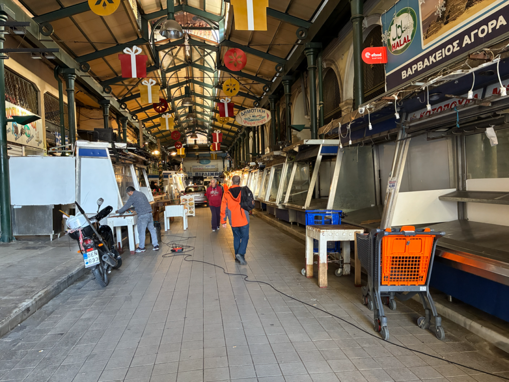 庭園の次は市場見学として、中央市場(ヴァルヴァキオス市場)へ来てみましたが、クリスマスの影響か数件のお肉屋さんを除き、市が立っていませんでした。。。シャッター街。残念だが次々。