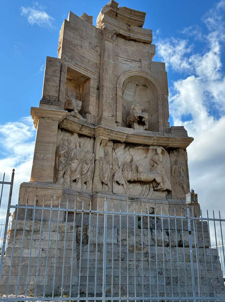 フィロパポス記念碑。下部のレリーフはローマ風(騎馬像・行列)。見た目はローマ的、「古代ギリシャ+ローマ支配期」の混ざり合いを象徴する建物