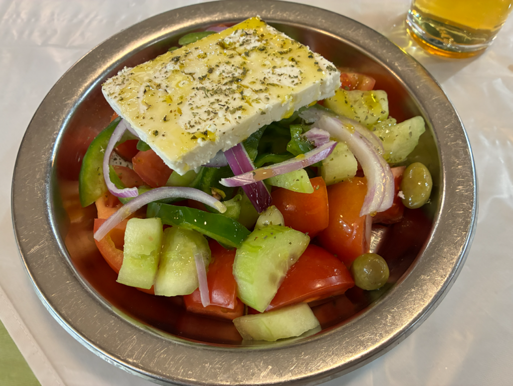 Greek Salad。フェタチーズの存在感が凄い。細かく分けてサラダと一緒に食べると良いアクセントに。