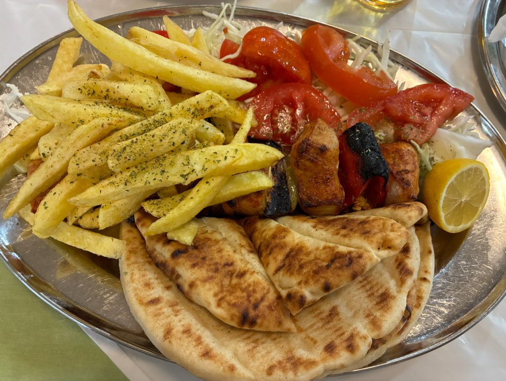 ギリシャ定番のChicken Souvlaki。串焼き+ピタ+ポテト。ボリューム満点。堪能しました。