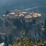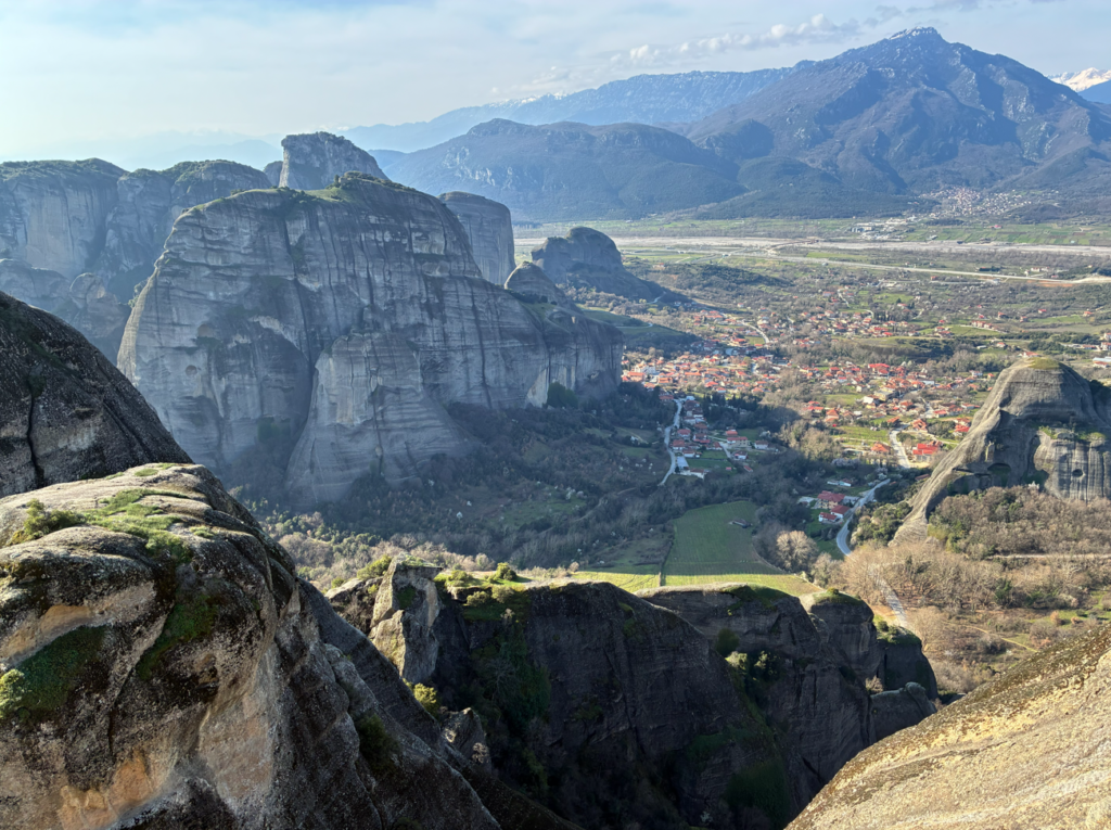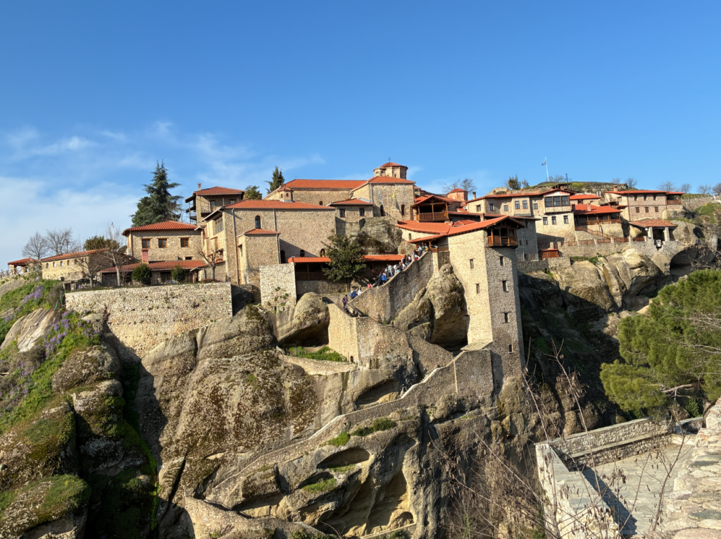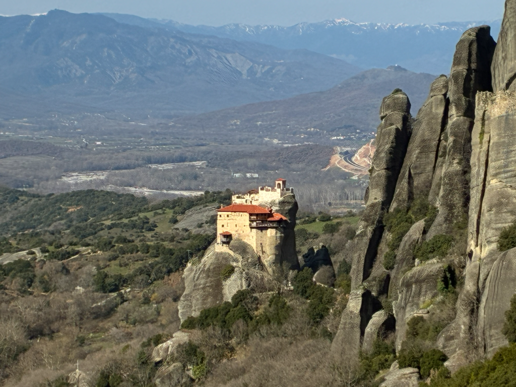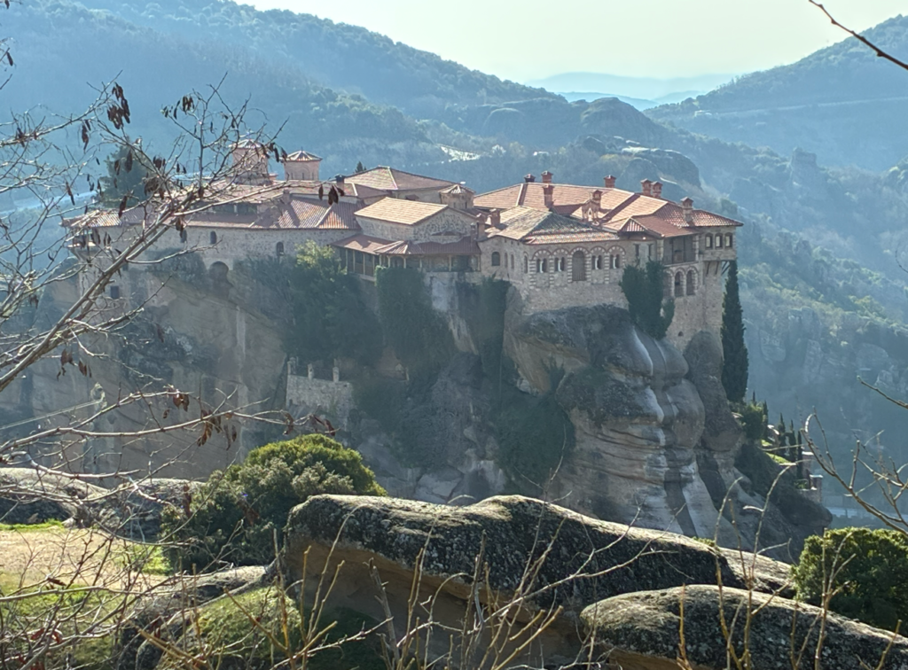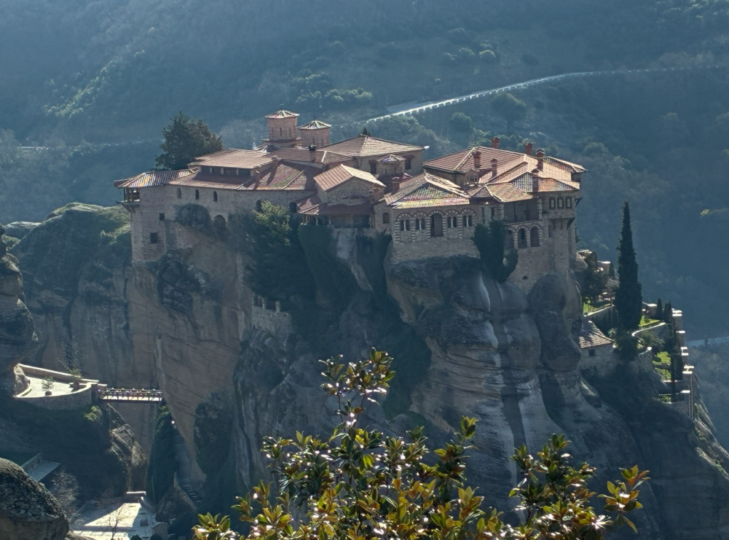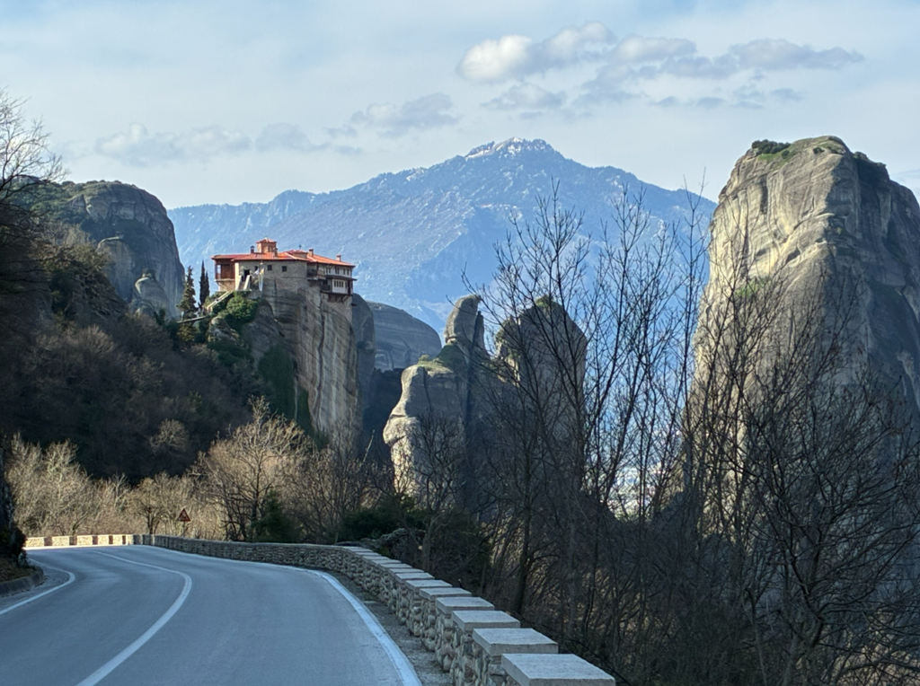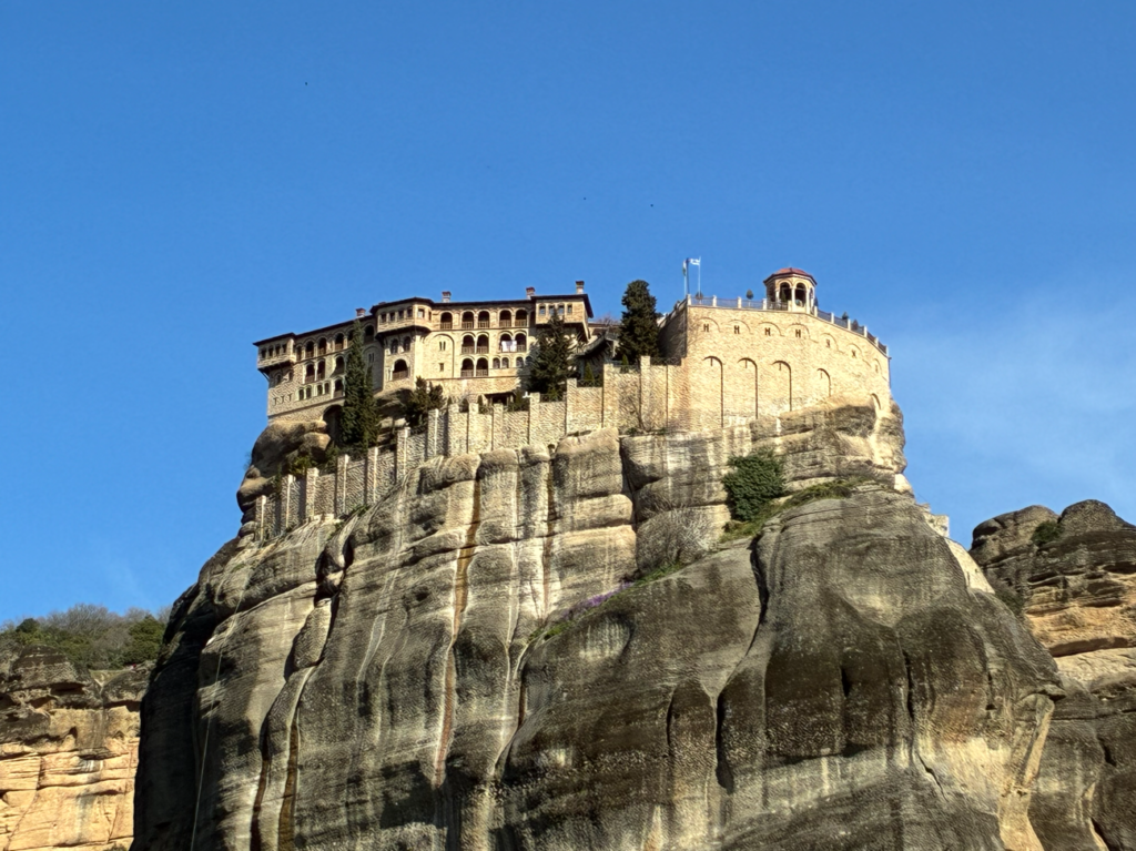 メテオラはギリシャでも最も神秘的な世界遺産の一つ。名前の意味はギリシャ語で「空中に浮かぶもの」。以前に来た時は下界から奇岩群および、はるか遠くの修道院を眺めるだけでしたが、今日は空中に浮かぶ修道院の内部見学もする予定。