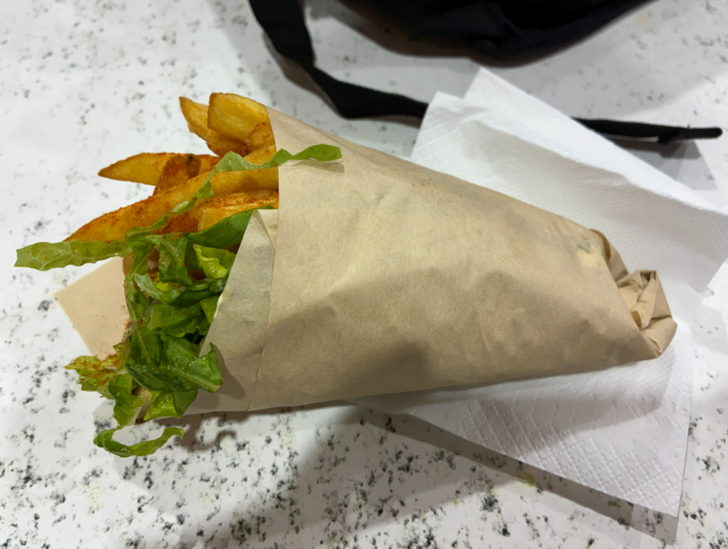 そしてディナーもジャイロ。Delicious Souvlaki。Googleマップ☆4.8。お店によって色々と味、アレンジも異なり飽きない。ここはレタスが入ってます。美味い。そして、安い。