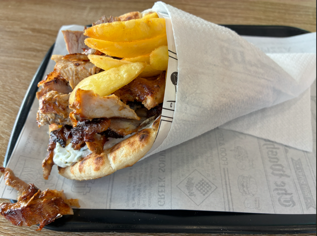 ギリシャはジャイロ、トルコはケバブ、中東はシャワルマと地域で呼び方が違い、アレンジも少し違います。ギリシャはフライドポテトが入ってるのが特徴。