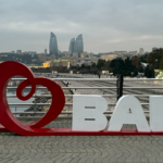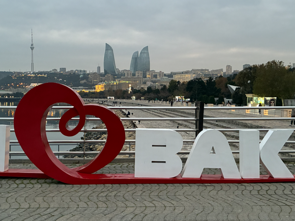 バクーの海沿い遊歩道バクーボレバード(Seaside Boulevard)。「I ❤️ Baku」オブジェ&カスピ海&フレームタワー(Flame Towers)ショット。
