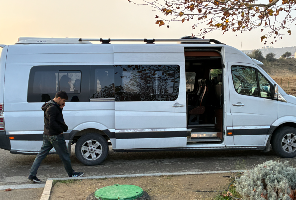 今日はツアーを利用してゴブスタン国立保護区泥火山の観光をしていきます。朝の8:40宿から徒歩5分ほどの指定場所でピックアップしてもらいスタート。こちらが今日のバン。ツアーや長距離移動(国境越え)バンはメルセデスばっかりですね。