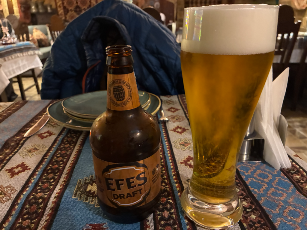 今日のディナーはFiruze restaurant。Googleマップ☆4.5。トルコ発祥のビール「EFES(エフェス)」のドラフト版。アゼルバイジャンでは最も一般的に飲まれているビールのひとつで、味は軽めで飲みやすいラガー。