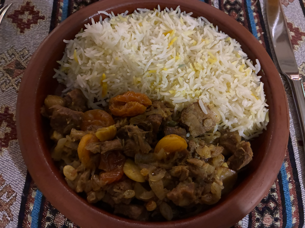 プラフ(Plov)。アゼルバイジャンのピラフ。日本のピラフと違い、米と具材を別で調理してから盛り付ける。私は日本式の混ざったピラフの方が楽で好きかも。