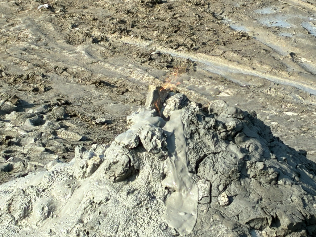 これは天然ガスに引火した“燃える泥火山”。噴気孔にあたる場所でライターを着火すると炎が出ます。ただ、そこまでガス臭は酷くありませんでした。