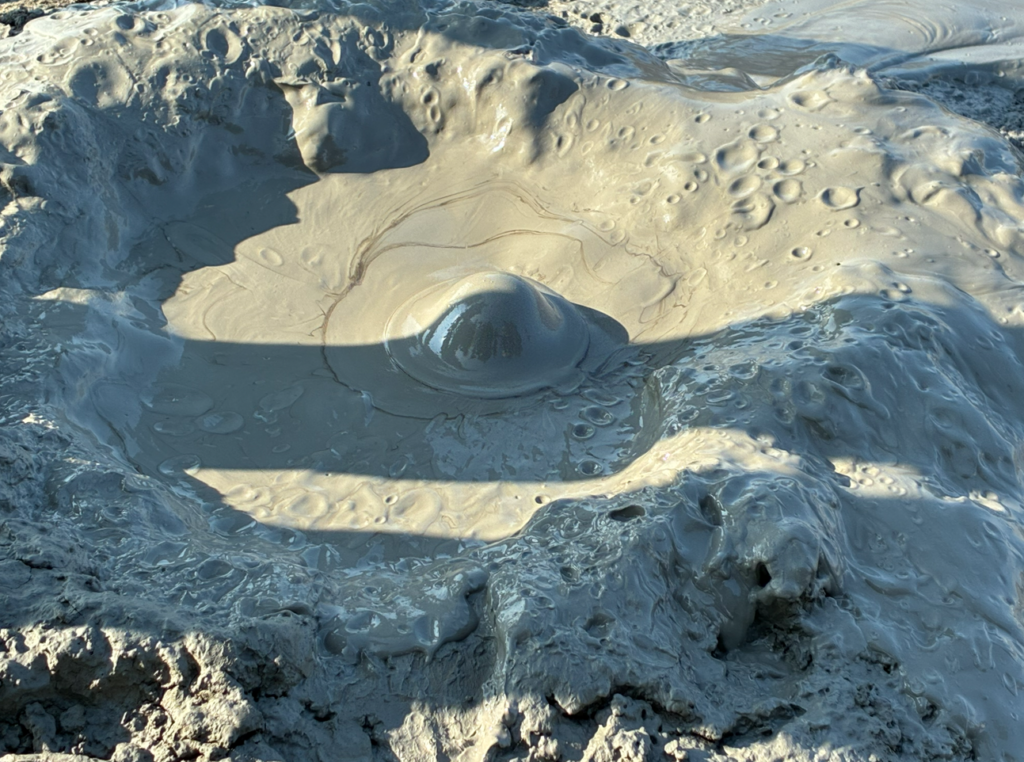 泥火山(Mud Volcano)。普通の“マグマの火山”とは全く違うタイプの火山で、“ガスの圧力で泥が吹き上がる現象”=泥火山。触ってみましたが熱くなく、低温でした。火山と呼ぶのに違和感が。