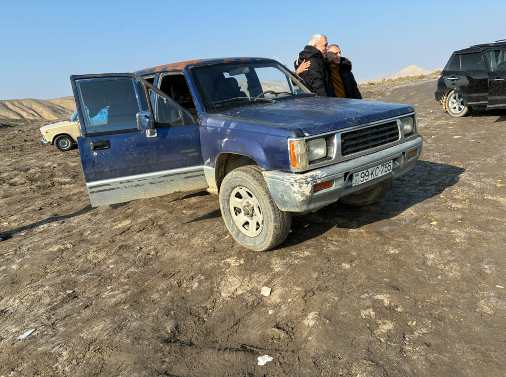 本ツアーもう一つのイベント泥火山。泥火山の見学場所までは、デコボコの悪路を20分ほど走るため、ボロボロの四駆車に乗り換えて移動します。常にヘッドロックするほどの悪路。