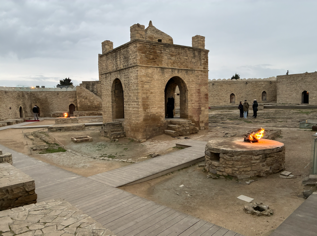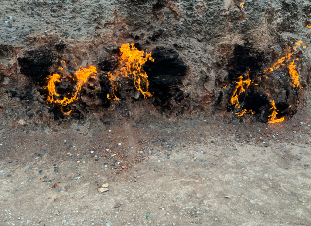 地中の天然ガスが隙間から噴き出しており、ライターなどではなく自然に着火した炎が数十年〜百年以上消えず燃えているそうです。アゼルバイジャンは「火の国(Land of Fire)」と呼ばれる理由(天然ガスが地中の浅い層に大量に存在する)ですね。思ってたほどガス臭い訳じゃないのが良い。