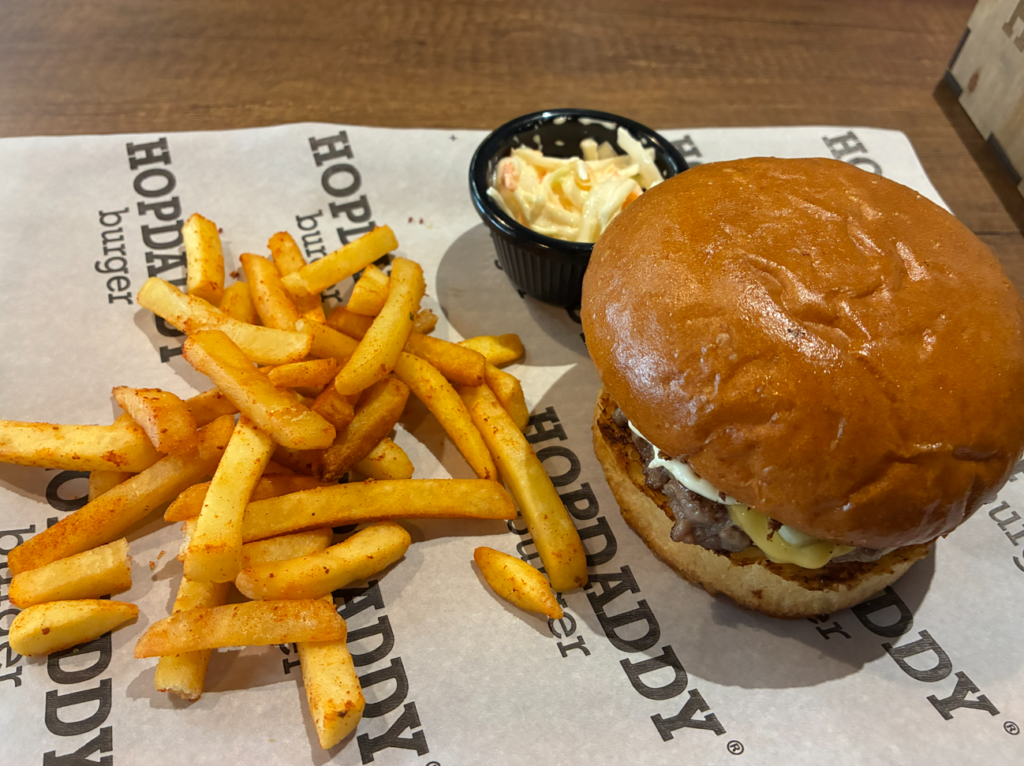 ツアーは午後からなのでまずは、ブランチHOPDADDY Burger Baku。Googleマップ☆4.5。ハンバーガー店。コールスローサラダが付いてるのが良き。