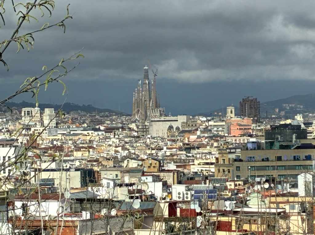 お次はモンジュイック(Montjuïc)へ登って行きます。バルセロナの街を一望。明日行く予定のサグラダファミリアが遠方に見えます。明らかに異質の存在。