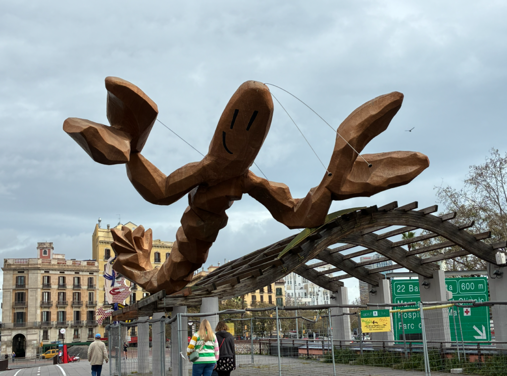 スペイン2日目、本日は日曜日でサグラダファミリアの予約が埋まってて、取れなかったので街歩きDAYに変更。歩いているとロブスターの彫刻を発見。顔がかわいい。流石シーフードの街。