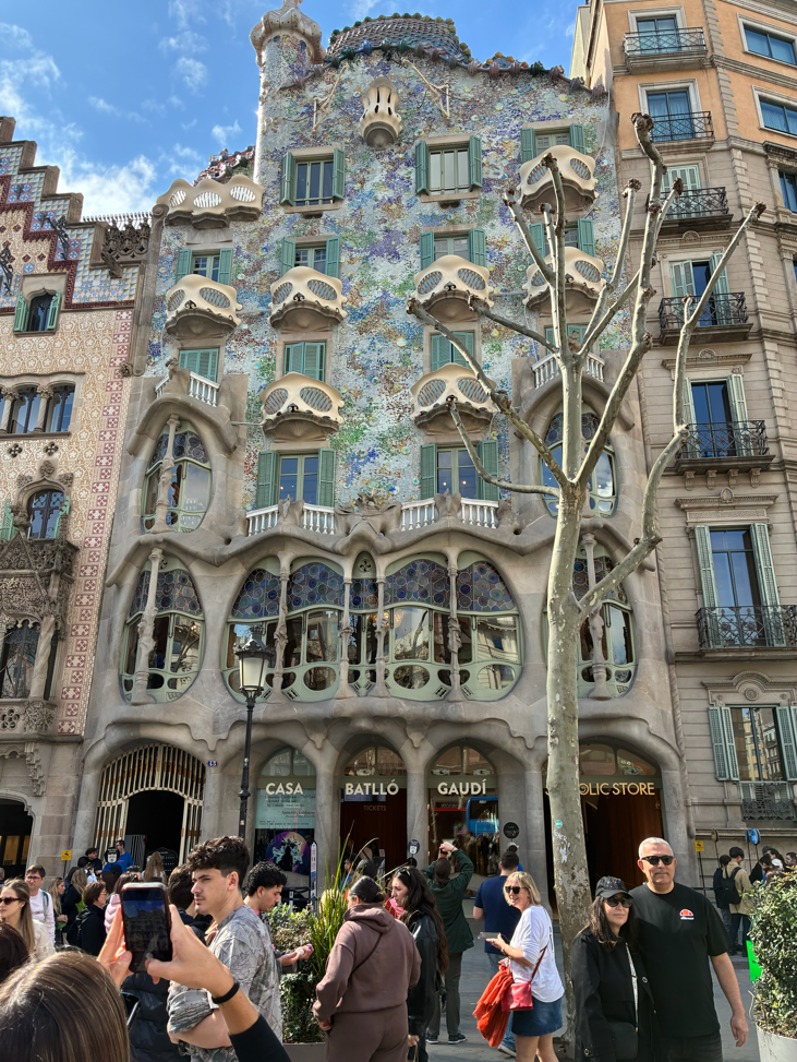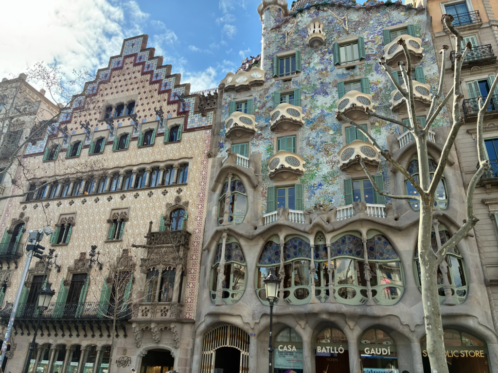 写真の左、ギザギザの屋根の建物はカサ・ミラ(ガウディ)ではなく建築家Josep Puig i Cadafalchの作品。この通りは建築バトルの場所らしく、これら以外にも特徴的な建物がある名物通りのようです。