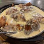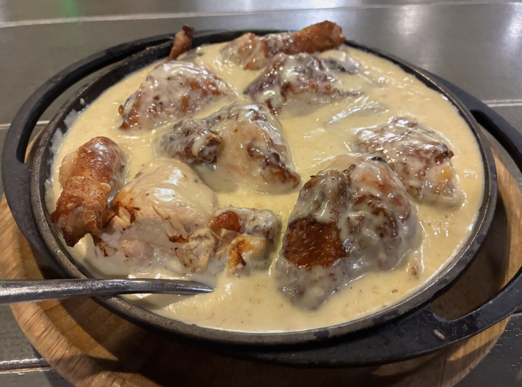 ジョージアの伝統料理シュクメルリ(Shkmeri)。ガーリックチキン煮込みの代表格。美味い!が、骨が多すぎて食べるのは大変でした(笑)。