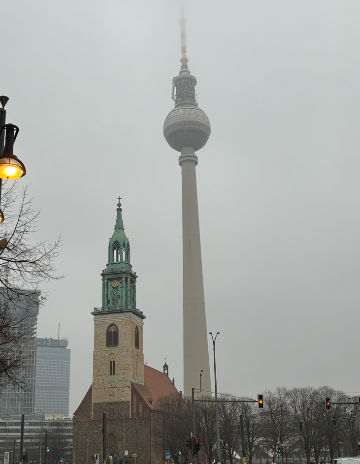 右の高い塔がベルリンテレビ塔(Fernsehturm)=展望台。左の教会がマリエン教会(Marienkirche)=中世のキリスト教会。