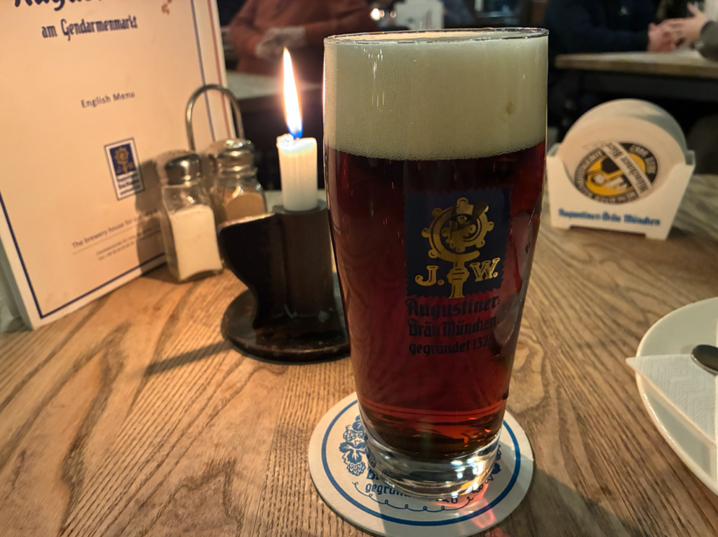 ドイツの黒ビールAugustiner Dunkel / half Maß(0.5L)。モルト感強め、苦すぎない食事に合うビール。