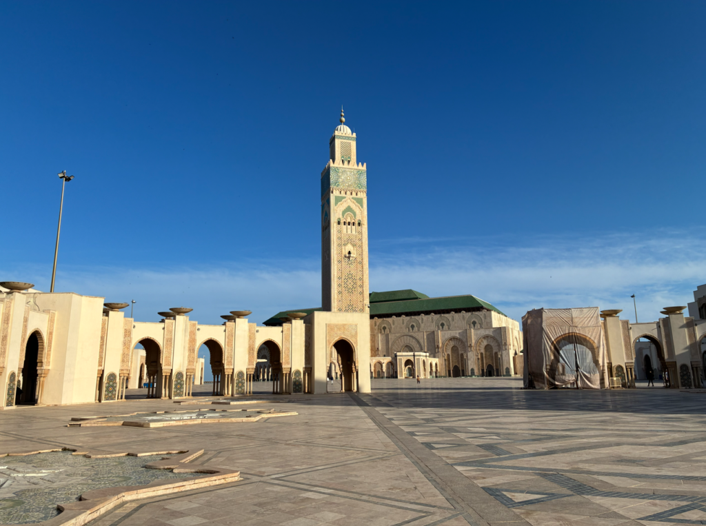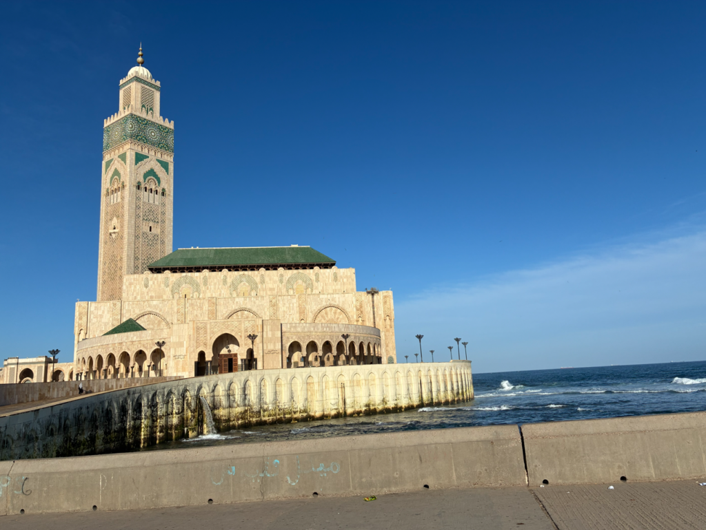 モロッコでは珍しく非イスラムでも見学可能なモスクですが、飛行機の予定がある為、外観のみ。海の上に建つ世界的にも珍しいモスクを堪能して次へ移動。