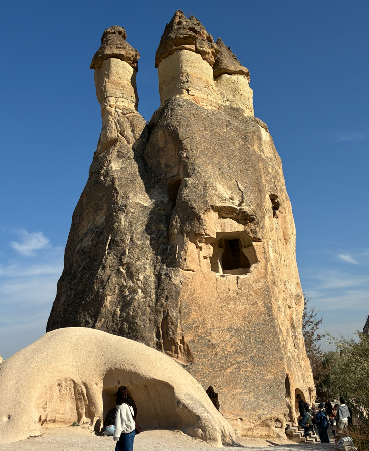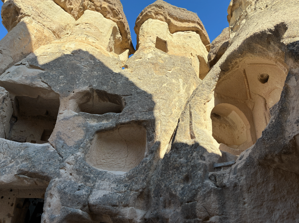 岩窟教会(Cave Church)で、写真の大きなキノコ岩(フェアリーチムニー)は、もともと修道士(モンク)たちが隠遁生活のために住んでいた岩で、その内部を掘って礼拝所(チャーチ)、住居、修行場所として使っていたとか。