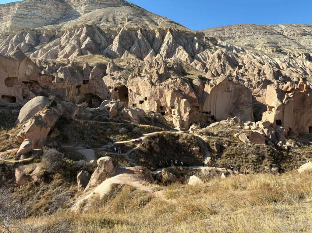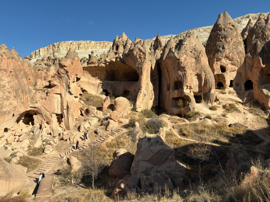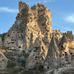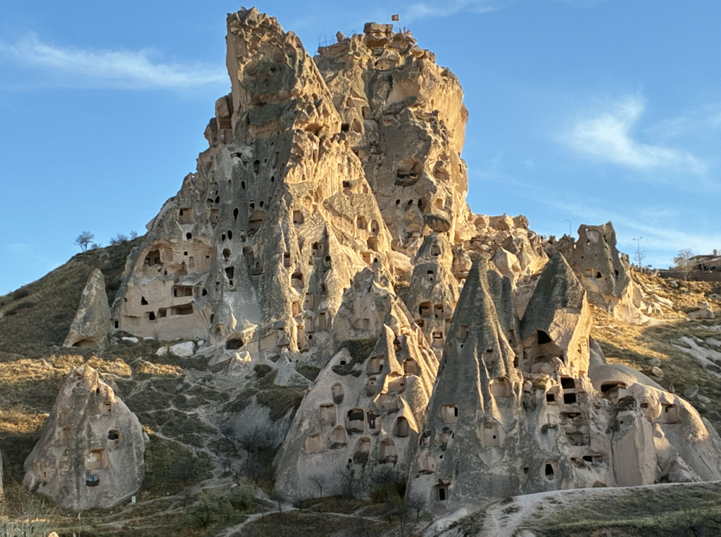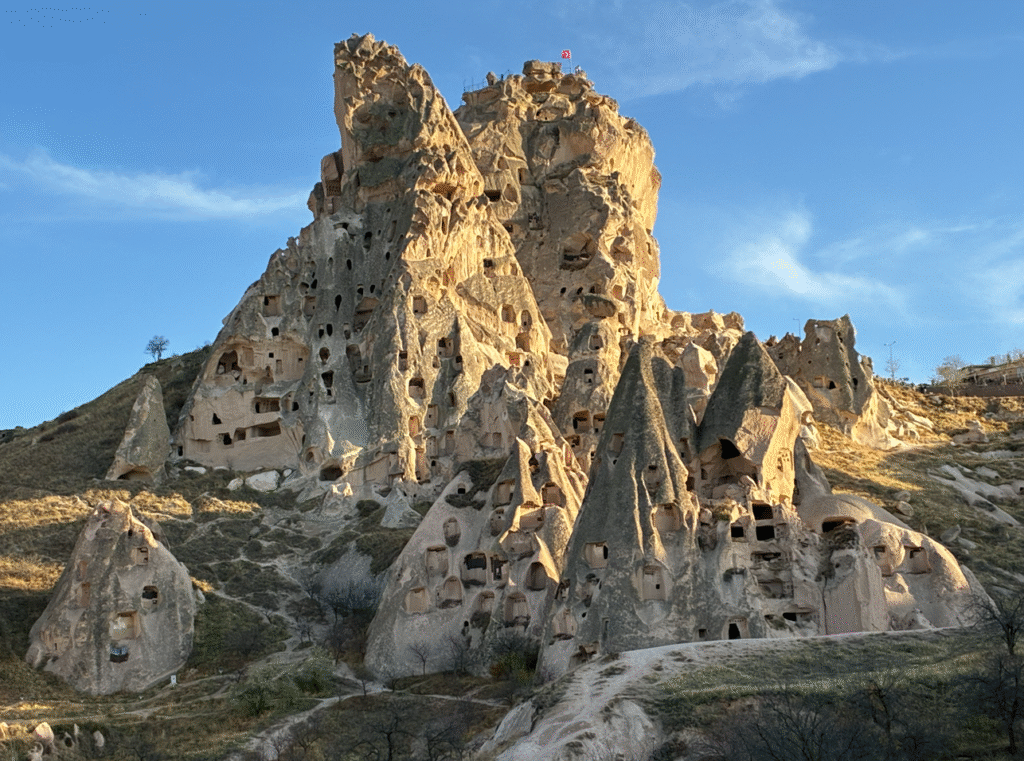 最後は、ウチヒサル城(Uçhisar Castle)。この巨大な奇岩は自然にできたものだけど、古代の人々が 何百もの部屋・通路・倉庫・教会 を掘って、まるで「岩山丸ごと要塞」のように使ってきた場所。