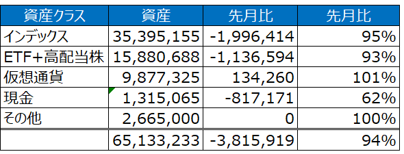 2026年3月31日付けの資産総額は、65,133,233円。先月比ではマイナス380万円になりました。これで3カ月連続のマイナス運用の結果になってます。年初の7,200万円からみると700万円くらい減少しており、よろしく無い状況ではありますが、旅行は物価が高くて、しんどかったヨーロッパを抜けた後なので少し気楽ではあります。さて、分析結果していきます。
