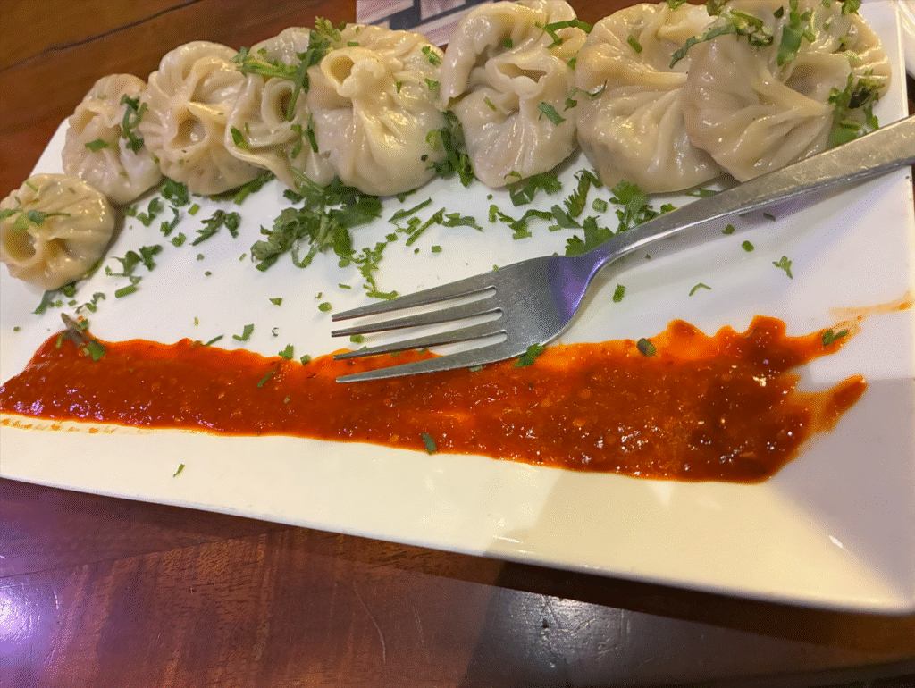 ネパールで何度も食べたSteam Momo(スチーム・モモ)。この赤いソースはかなり激辛。ネパールモモのソースはまだ食べれたが、このソースは辛すぎて無理。モモだけで頂きました。