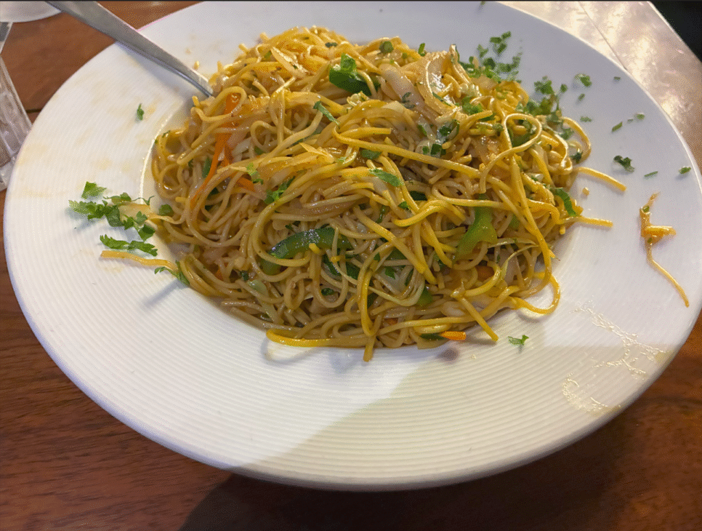 Chowmein(チョーメン)。インド・ネパール風の中華焼きそば。グリーンチリ(青唐辛子)が潜んでおり、当たると激辛。頑張って避けて食べました(笑)。