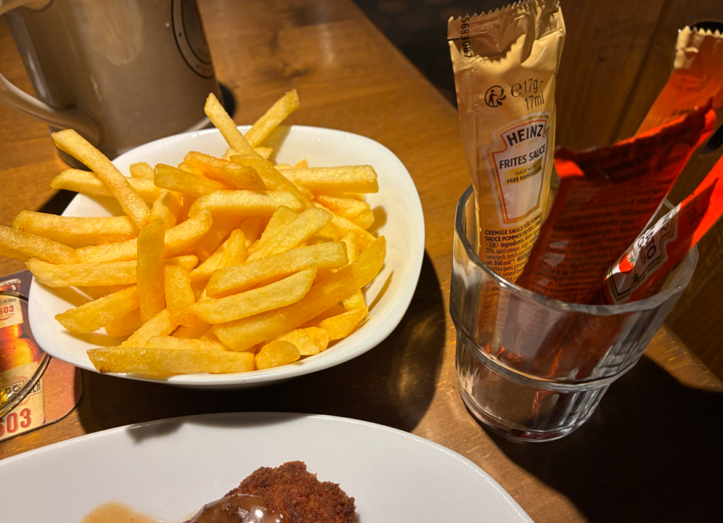 メインはドイツ料理の王道シュニッツェル「Jägerschnitzel(イェーガー・シュニッツェル)」&フライドポテト(Pommes)。衣はザクッと硬め。肉は薄めだけどサイズがデカい。ドイツ風トンカツ美味い。