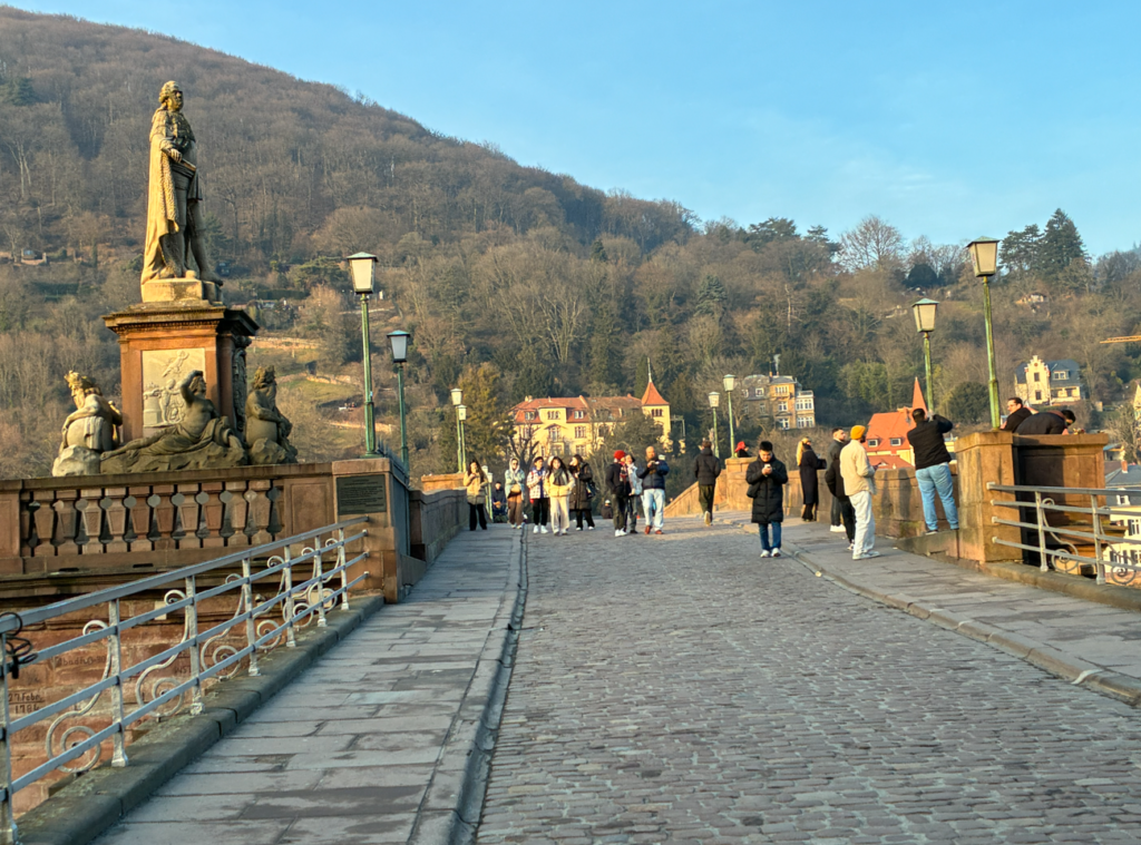 先ほどハイデルベルク城から見下ろしていた橋を歩いて渡ります。多くの観光客が、写真を撮り合っている人気スポット。