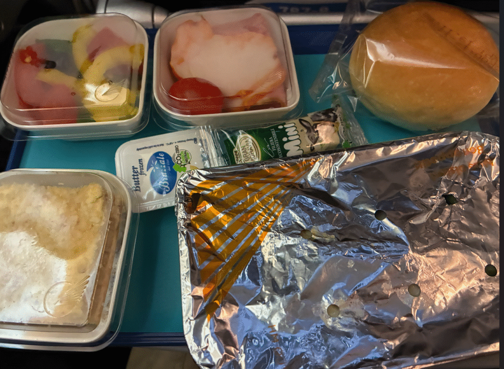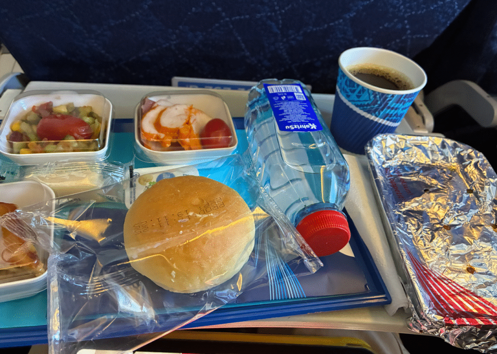 テルアビブのTLVベン・グリオン空港からアゼルバイジャンのGYDバクー・ヘイダルアリエフ国際空港へアゼルバイジャン航空で飛びます。機内食1回目(ビーフ)。