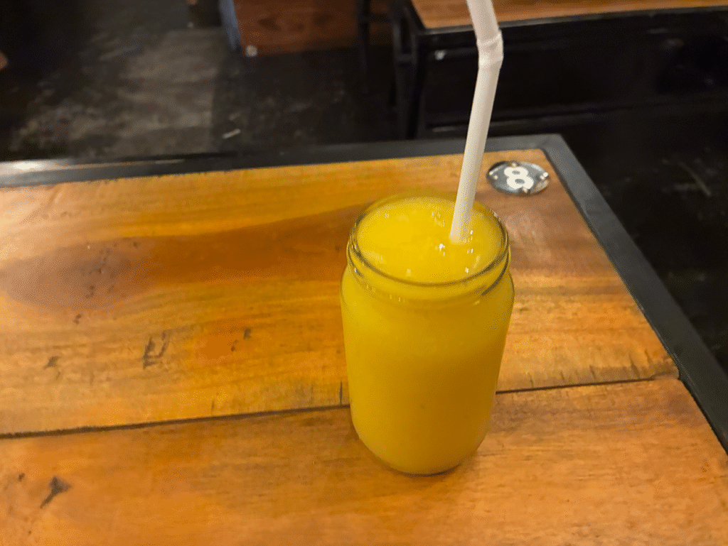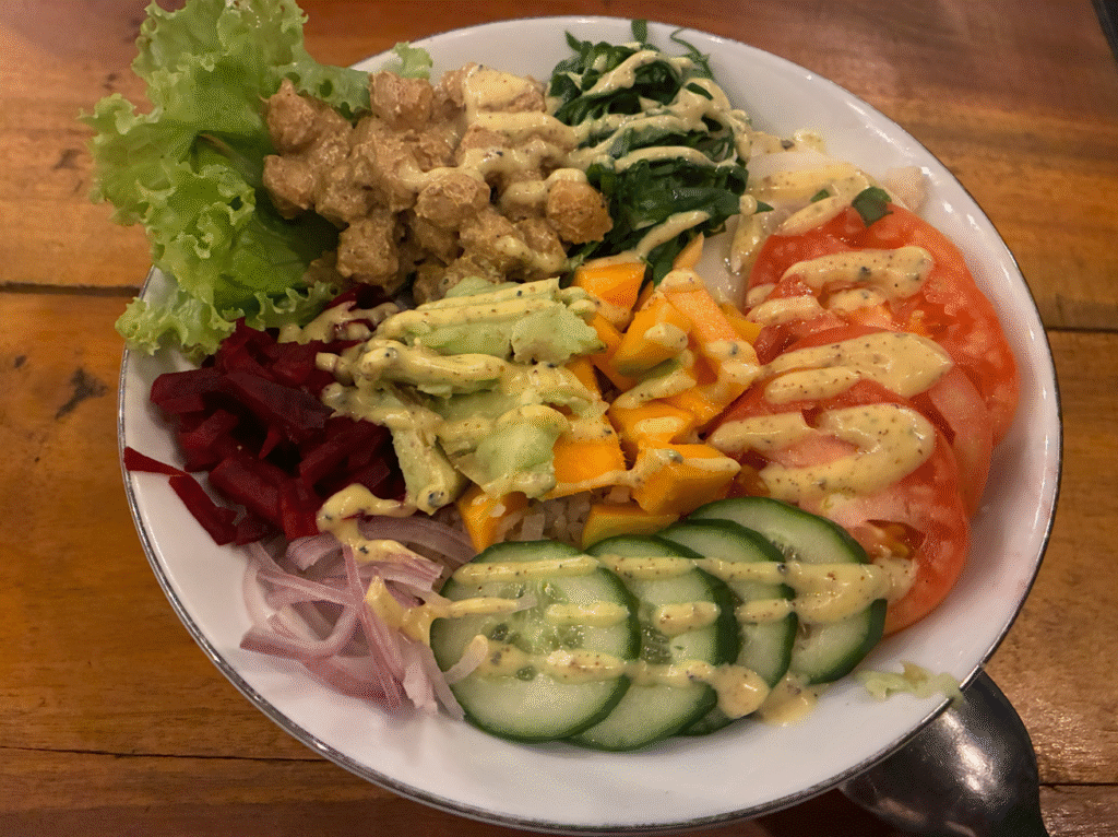 マンゴージュースとポケボウル(Poke Bowl)。玄米にアボカド、ホウレンソウ、トマト、キュウリ、ひよこ豆などかなりのヘルシー料理。美味い。