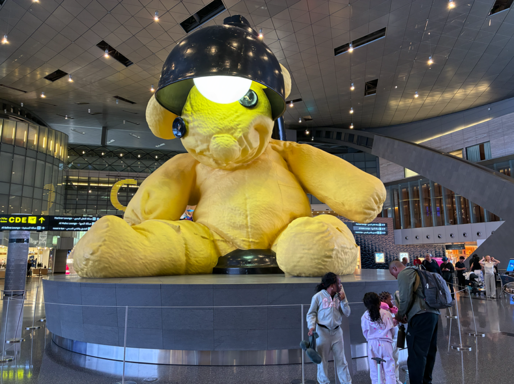 昨日に引き続き54ヶ国目になるケニアを目指して移動していきます。昨日の23時にエジプトからドーハ(カタール)空港まで移動していたので、今日はドーハ空港スタート。ドーハ空港名物の熊の巨大人形。この人形に会うのも3回目かな。ハブ空港だけあってよく利用します。