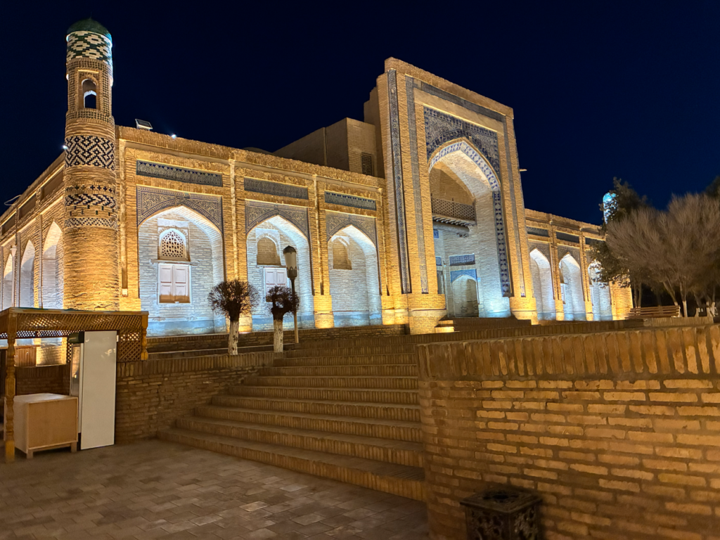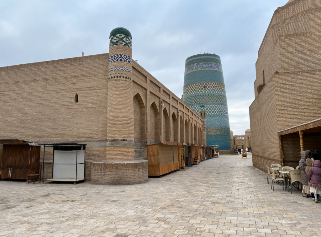 イチャン・カラ西門の外から見るカルタ・ミナルは、その異様な太さが際立つ。隣接するムハンマド・アミン・ハーン・メドレセと並ぶ姿は、ヒヴァ観光の定番構図。