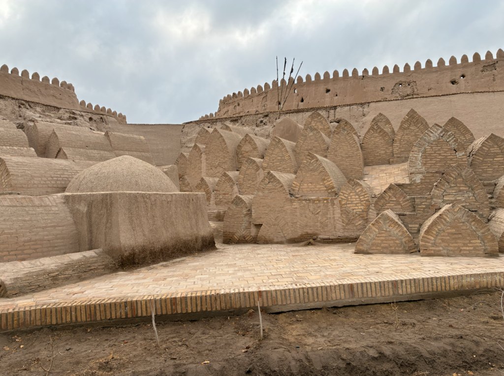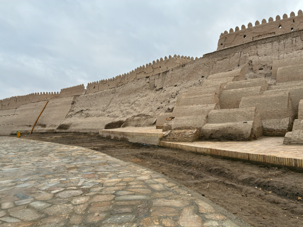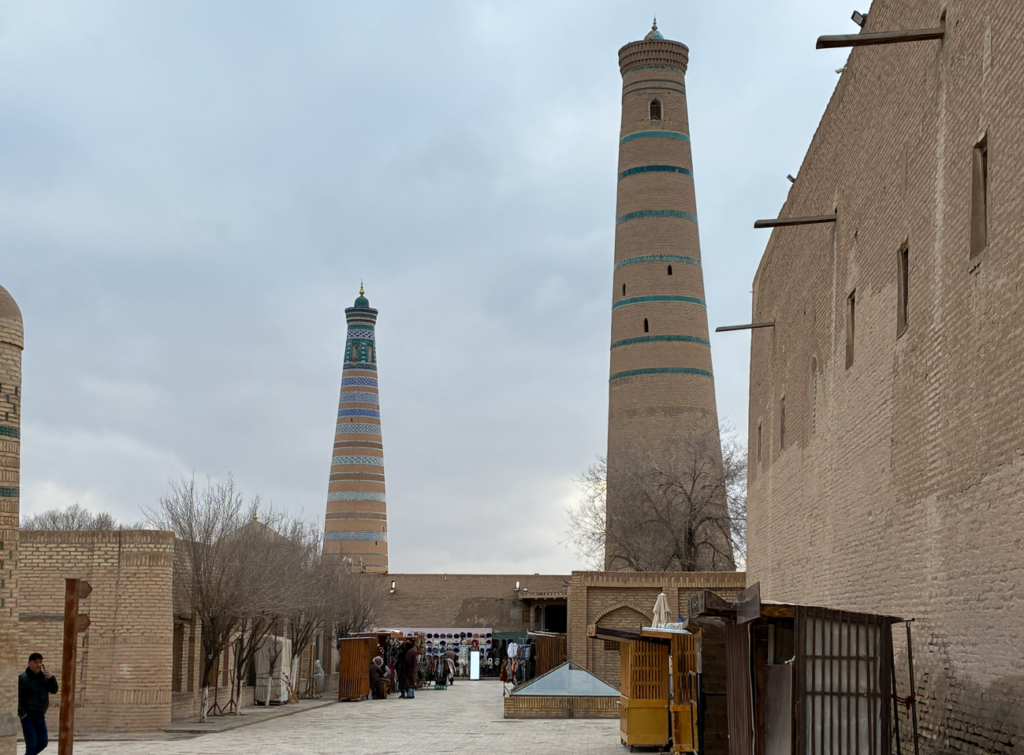 城壁の外から見上げると、ヒヴァを象徴する二つのミナレットが同時に視界に。右のイスラム・ホジャ・ミナレットは市内最高峰の塔で、均整の取れた縞模様が美しい。一方、左奥に見えるカルタ・ミナルは建設途中で止まった“未完のミナレット”らしいが、とても綺麗に見えます。