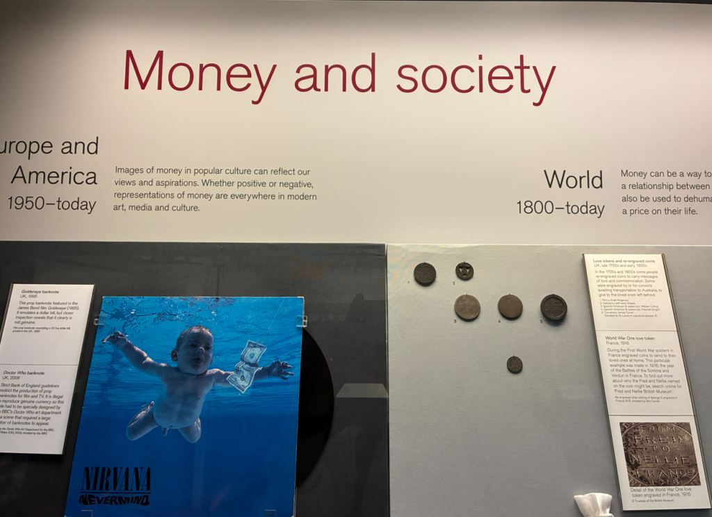 そして最も面白いと思ったのはお金や通貨のコーナーにあった。NirvanaのNevermind(1991)ジャケット。この有名すぎるジャケットは、水中の赤ん坊が、1ドル札に釣られて泳いでいく。=生まれた瞬間から人はお金に引き寄せられるという、資本主義への痛烈な皮肉。「Money and society」というテーマにドンピシャでセンスあるなぁ。と、見て楽しくなりました。