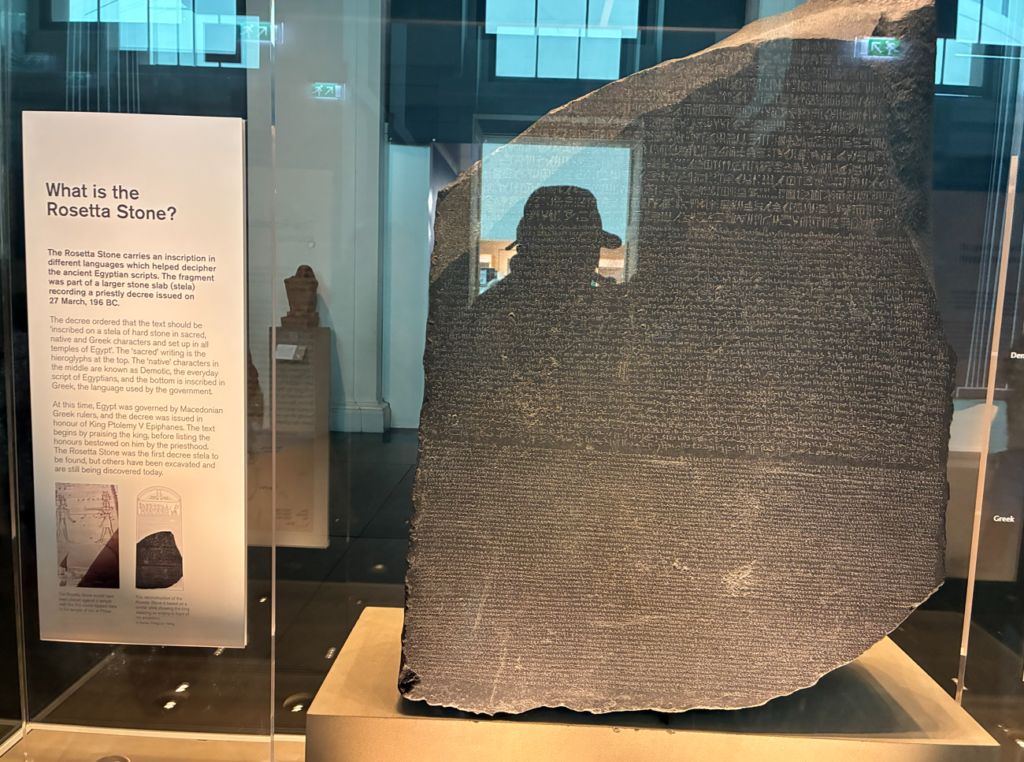 そして、これが大目玉のロゼッタ・ストーン。凄い人だかりで見学の順番待ちが。。。古代エジプトの文字(ヒエログリフ)を解読する決定打になった石碑。