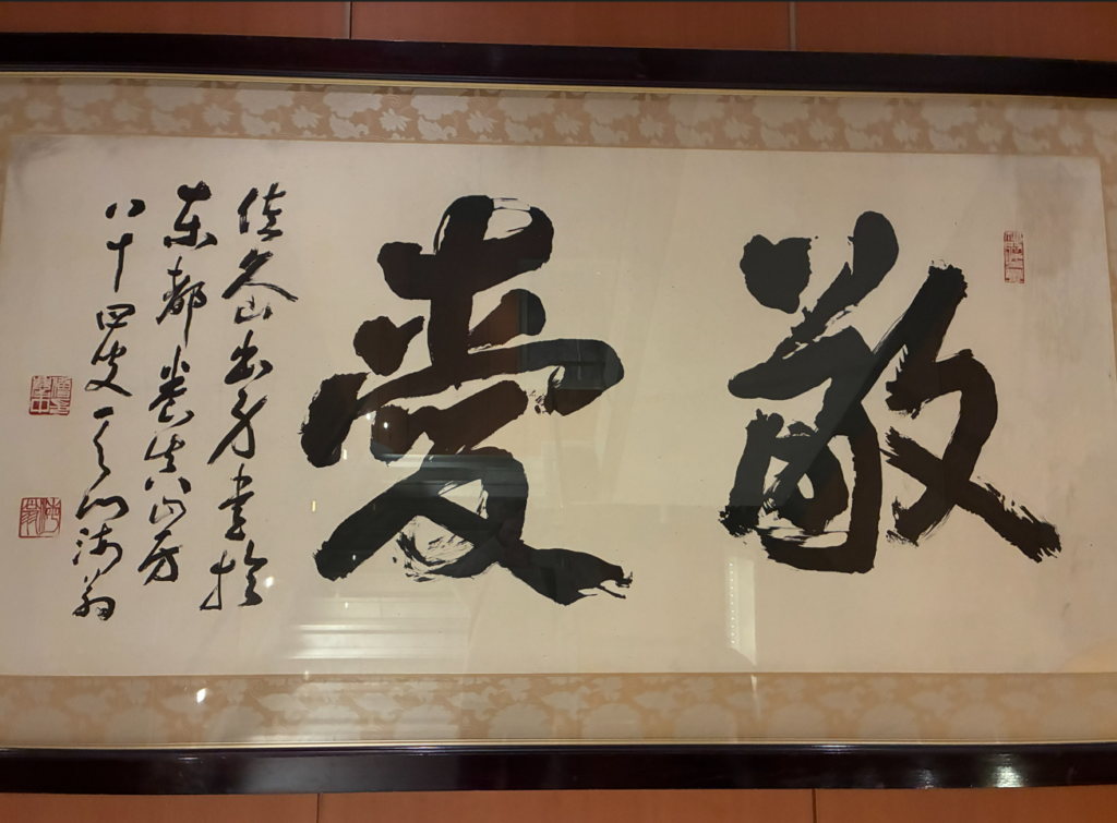 ちなみに、階段入り口にドーンと書道が展示されてましたが、私には読めませんでした。。。右は敬だと思うけど、左の文字は愛?ちょっと違う気が。