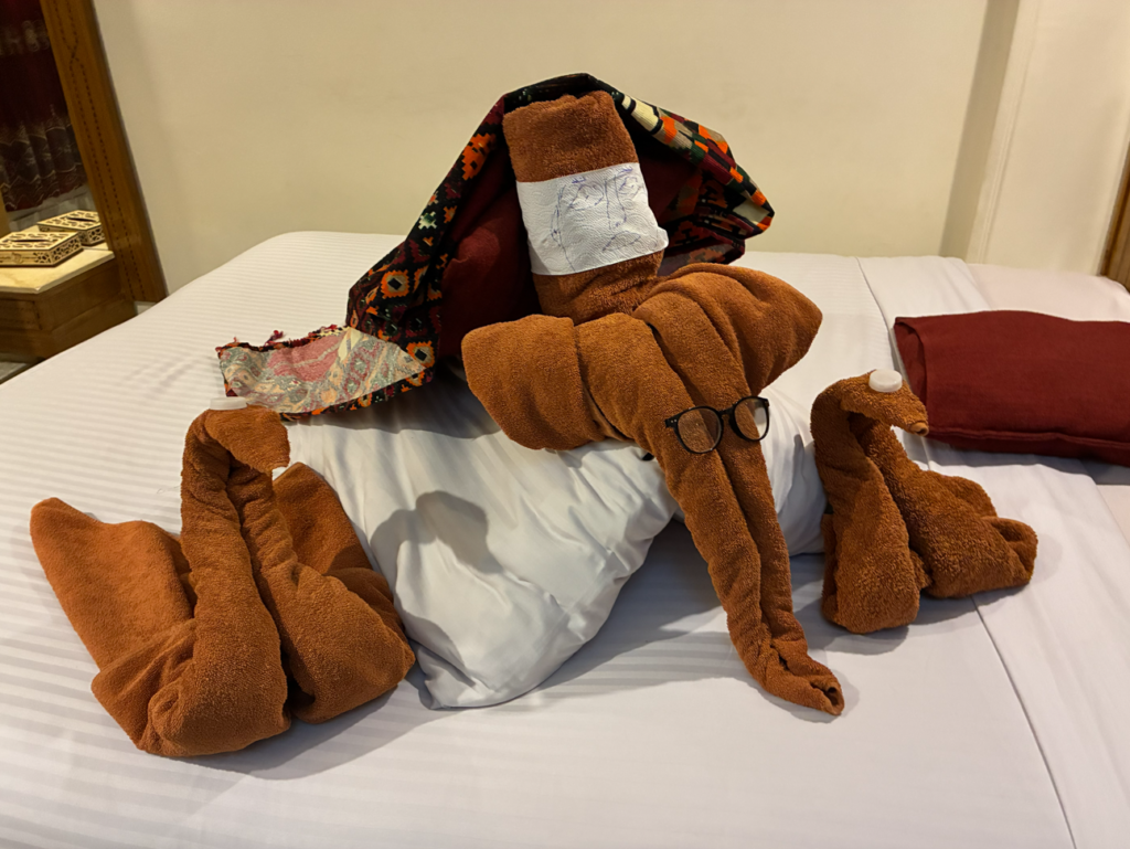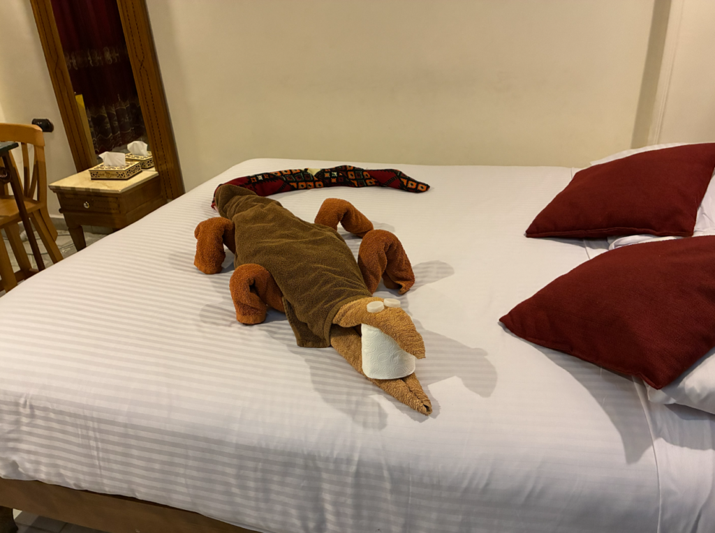 ちなみに、昨日はワニでした。これは、タオル&ペットボトルの蓋、トイレットペーパーを組み合わせて作られており、ルームメイキングの度に新たな工作が。こういうの見ると全然チップ渡すんですけどね。なごむわ~。