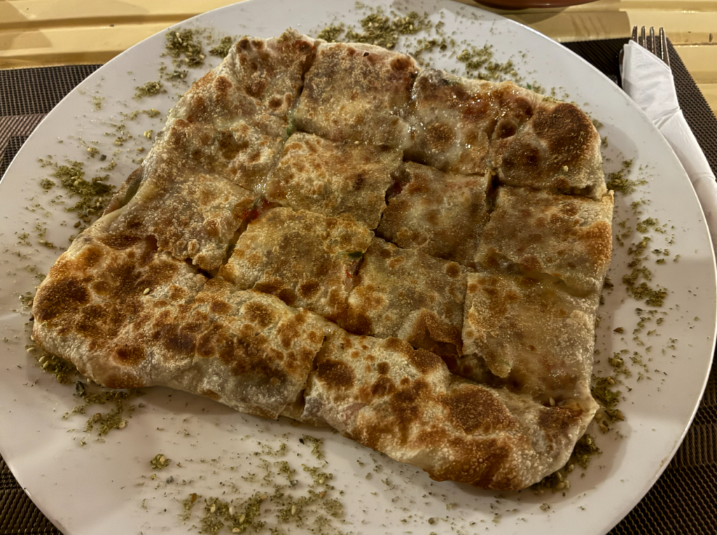 エジプト風ピザで美味いと勧められたフェテーラ(Fetera Lahma)。パイみたいに層になった生地がモチモチで、肉の旨みとバターのコクがガッツリ。これも美味い。