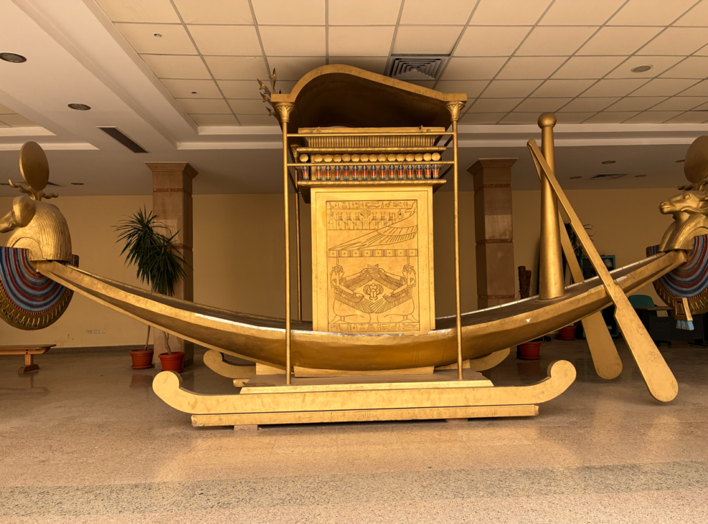 カルナック神殿に入ると直ぐに太陽の船(ソーラーボート)の展示が見れます。カルナック神殿の主神アメン神の像を乗せて運ぶ“神輿”みたいなものとか。神を乗せて運ぶ”お神輿”の概念ってどこでも共通なんですね。